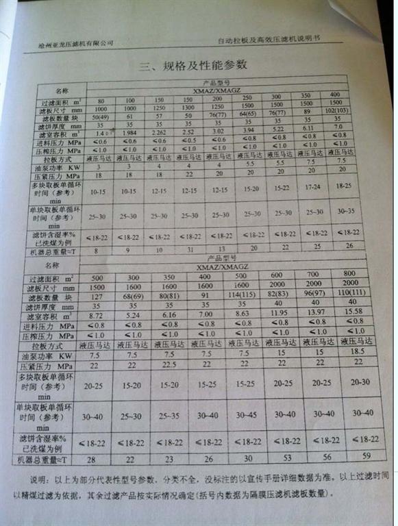 說明:部分代表性 壓濾機(jī) 型號(hào)參數(shù),分類不全,沒標(biāo)注的以宣傳手冊(cè)詳細(xì)數(shù)據(jù)為準(zhǔn)。以上過濾時(shí)間以精煤過濾為依據(jù),其余過濾產(chǎn)品按實(shí)際情況確定(括號(hào)內(nèi)數(shù)據(jù)為 隔膜壓濾機(jī) 濾板數(shù)量)