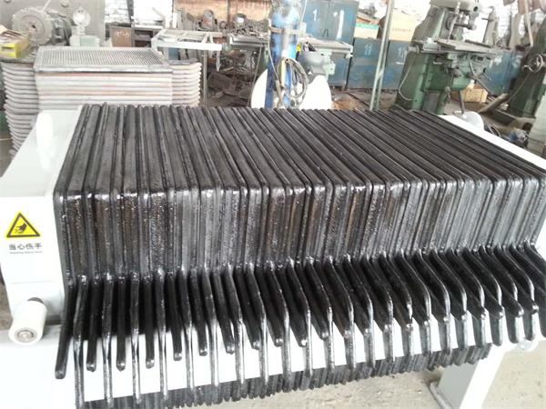 廂式壓濾機(jī)的濾板其實(shí)很簡(jiǎn)單,整齊劃一,每一塊壓濾機(jī)的濾板(這里所說(shuō)的濾板是除去了頭板和尾板)其實(shí)是一樣的。兩面向中間凹陷,深度在25mm左右,底面有無(wú)數(shù)的盲點(diǎn),起到的作用_是增大濾板于濾餅之間的摩擦力,支持濾餅的重量。在中間有進(jìn)水孔,它的目的是將進(jìn)料閥送進(jìn)來(lái)的混合液分配到個(gè)個(gè)濾腔之中。在下方還有出水洞,用于排出過(guò)濾出來(lái)的濾液。